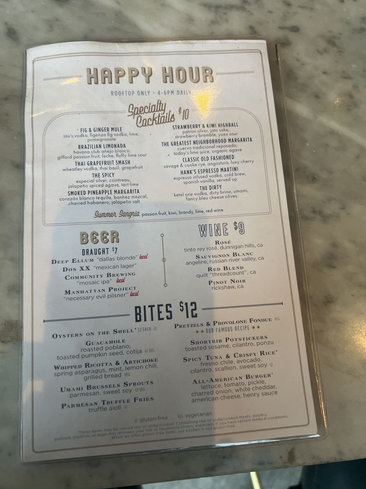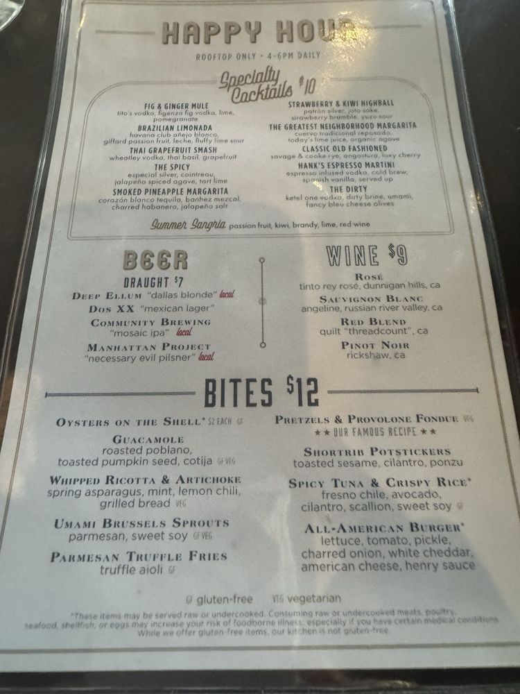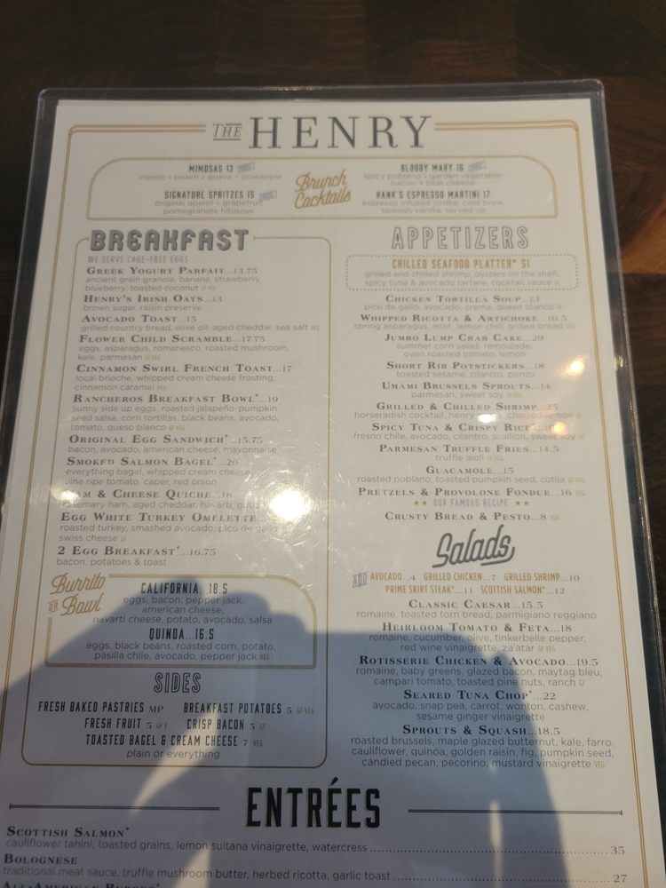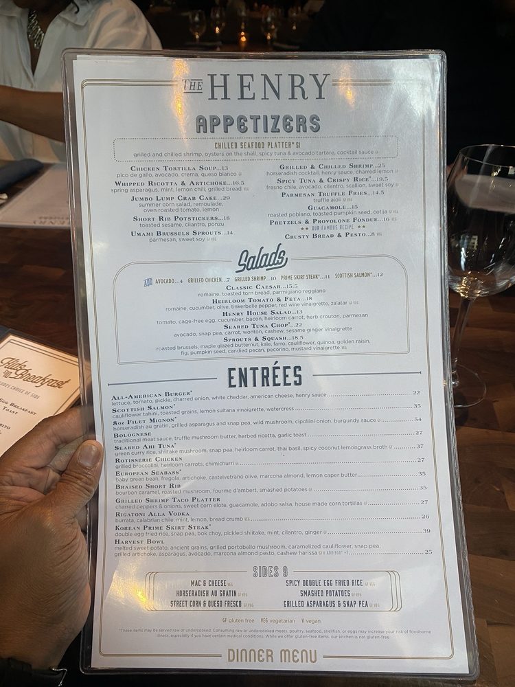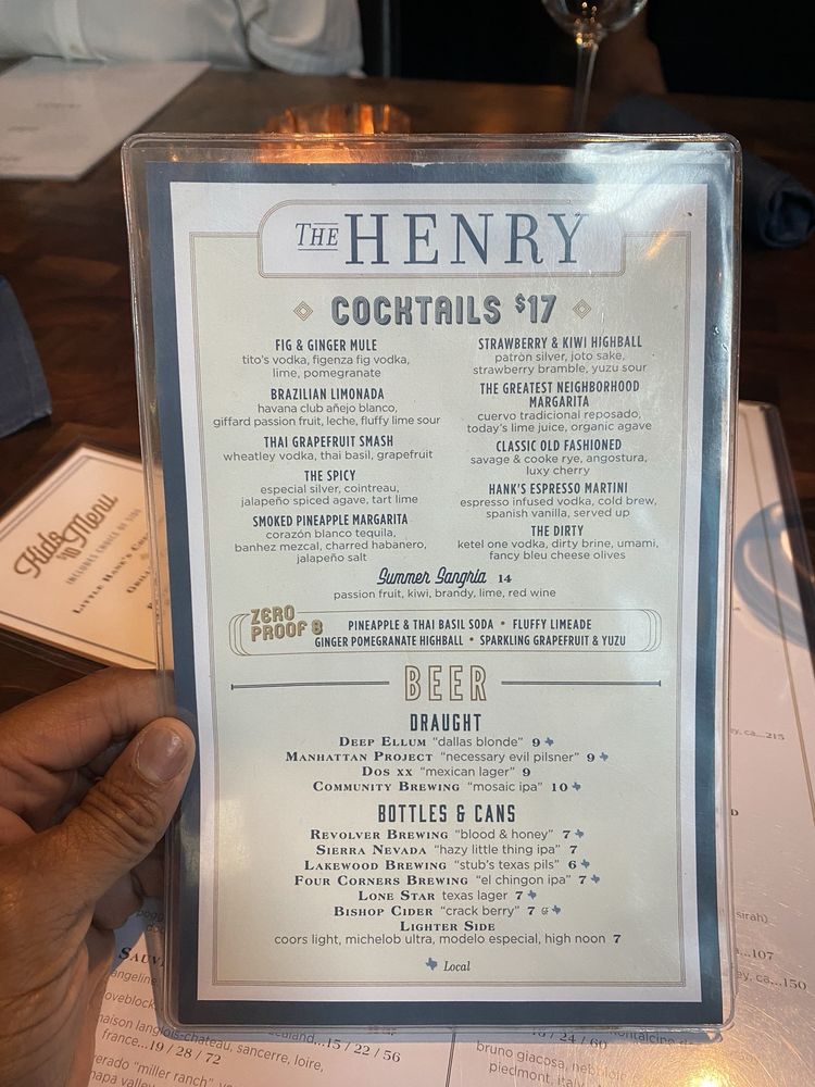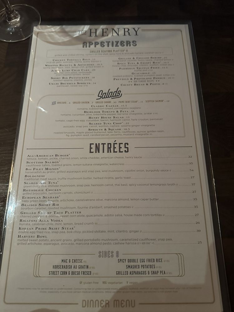 Introducing the menu at The Henry, located in downtown Dallas, offers a variety of appetizers, salads, and entrees. Standout dishes include the Chilled Seafood Platter with grilled shrimp and oysters, the Seared Tuna Chop salad with avocado and wonton, and the All-American Burger with white cheddar and Henry sauce. The ambiance is described as inviting and perfect for a family brunch. Customers praise the attentive service and the vibrant atmosphere, making it a great spot for brunch or a casual meal. The Henry also offers Happy Hour specials, outdoor seating, and a full bar for guests to enjoy. Overall, The Henry presents a classy yet laid-back dining experience with a diverse menu that caters to various tastes and preferences.